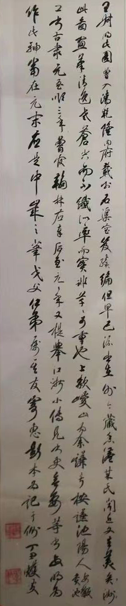 王蒙的山水画作品,有多种面貌,其差异主要在用笔用墨和不同皴法上。《葛稚川移居图》(故宫博物院藏),山石略带斧劈皴擦,不作一苔点,似有李成、郭熙遗意。《青卞隐居图》(上海博物馆藏),勾皴与披麻相结合;干墨与湿墨同时并用,挥洒放纵,极尽能事。《夏日山居图》(故宫博物院藏)以披麻皴为主,夹带解索皴,沉静浑厚,多取法于巨然。《太白山图》(辽宁省博物馆藏),浓墨重笔,用短笔解索皴并加以荷叶皴法,苔点满纸,似乎是在董源、范宽点法基础加以变体抒张。曾在苏州见顾氏旧藏另本 《葛稚川移居图》(著录于顾文彬 《过云楼书画记》中),以浓墨干笔长解索皴法写山石,散毫枯笔点苔,极其苍劲简老,可能是他晚年的作品。此幅 《涤砚图》在笔法墨法上介乎 《太白山图》与另本 《葛稚川移居图》之间。近处溪岸勾皴略带斧劈,是常用手法,溪对岸巨石,以长线条勾出轮廓略加纹理,进一步发展即成长解索皴。远处山峰,用淡墨干笔皴擦之后,再用浓墨枯笔点苔,似乎用的是一种秃笔散毫。整幅笔法苍劲、不拘成法,随心所欲。作者未注名创作时间,据此估计应属他中晚年时期的一件精心杰作。