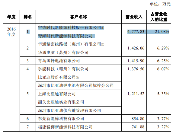 到了2016年,宁德时代已经成为了星云股份销售收入排名第一的客户,当年向其销售获得的收入占总收入的比例达21.08%。