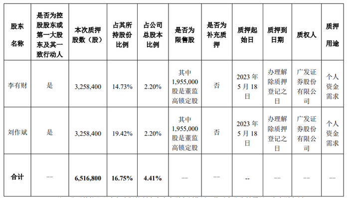 就在星云股份此次定增的预案发布仅一个月后,2023年5月,星云股份发布公告称,李有财、刘作斌将其持有的公司部分股份进行了质押。