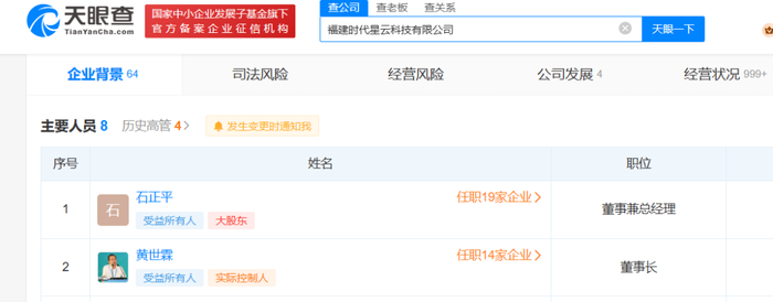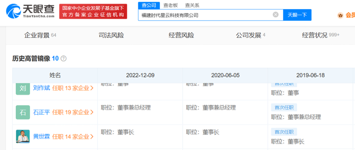 天眼查显示,自2019年6月起至今,时代星云的董事长一直由黄世霖担任,即宁德时代曾经的“二把手”。