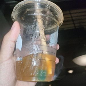 由于“橙C美式”下层是颜色较深的浓缩果汁,朱先生并未第一时间发现异常,拿到后也正常饮用,直到晚上7点左右发现杯底有异物,此时饮料已快喝完。