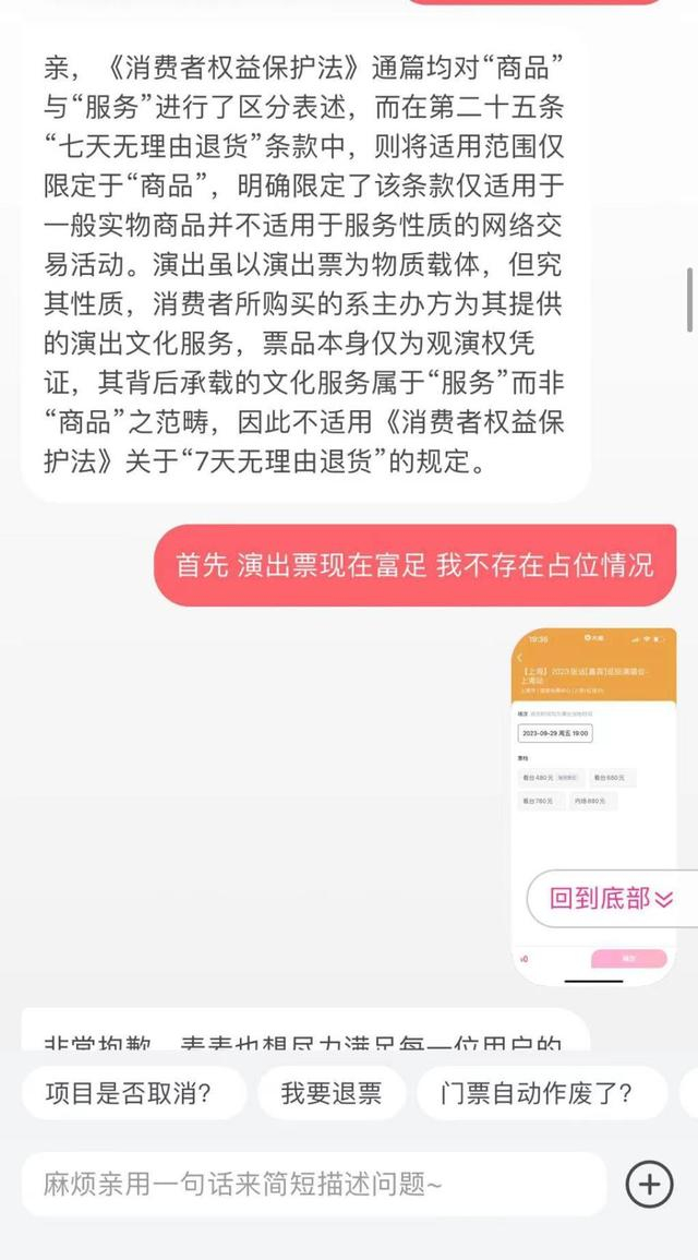 而针对演唱会门票是否适用《消费者权益保护法》中明文规定的“七天无理由退换”,大麦网客服表示,“七天无理由退货”适用范围仅限定于“商品”,而演出虽以演出票为物质载体,但究其性质是主办方提供的演出文化服务,因此并不适用。