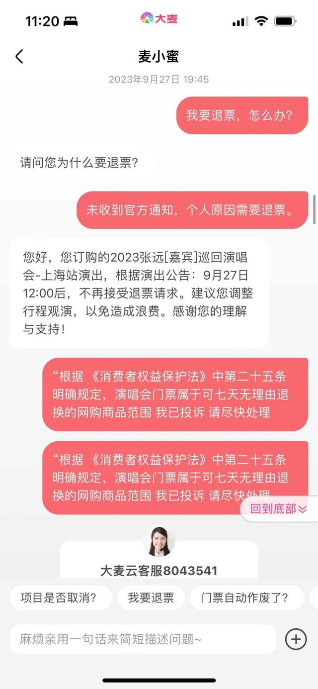 其中大麦网客服在与吴女士的沟通中称,根据张远“嘉宾”巡回演唱会上海站的演出公告,9月27日12:00后,不再接受退票请求。