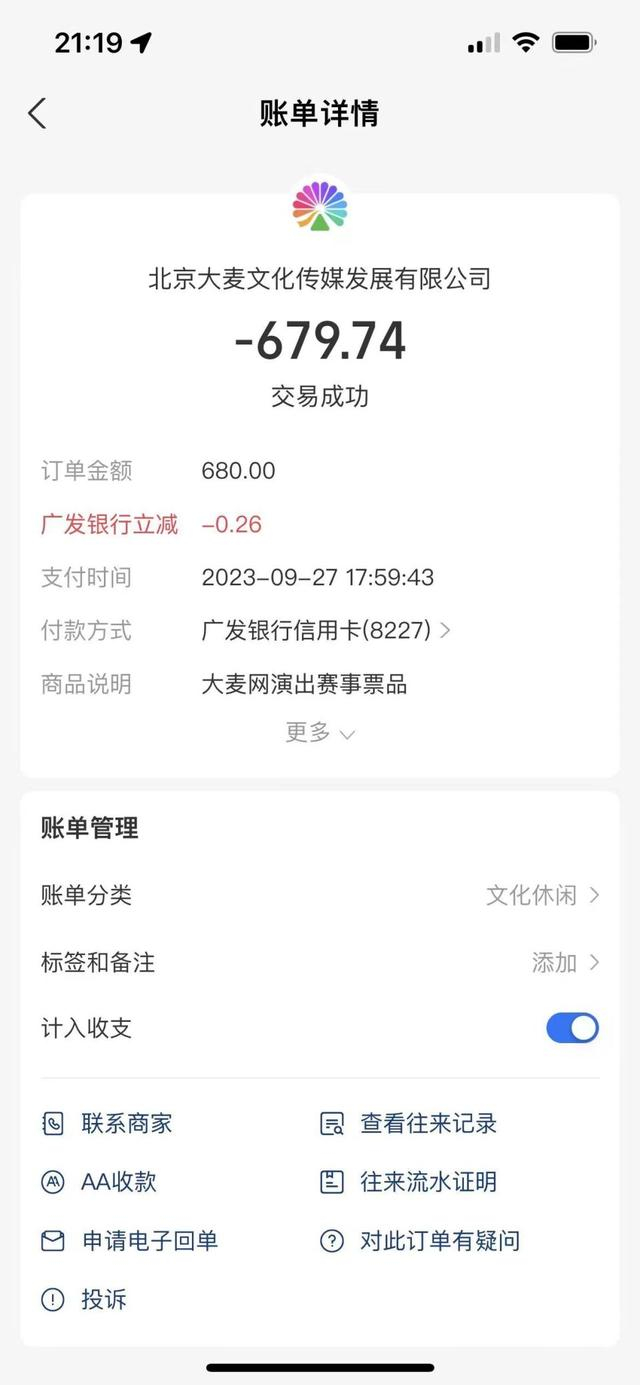 吴女士介绍,9月27日下午5点59分,她在大麦网首页抢购周杰伦2023“嘉年华”世界巡回演唱会上海站门票。点击“预约抢购”后,界面却跳转成2023张远“嘉宾”巡回演唱会上海站的抢票界面。由于抢票心切,吴女士未来得及分辨,便选择了彼时尚有余票的9月29日晚7点场次的680元票档并付款,实付679.74元。