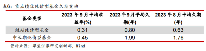 重点绩优纯债型基金中,2023年9月短期纯债型基金平均收益为0.31%,平均久期为0.80年,相比上月有所上升;9月中长期纯债型基金平均收益为0.45%,平均久期为1.99年,久期相比上月有所上升。