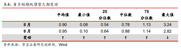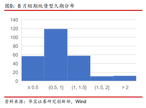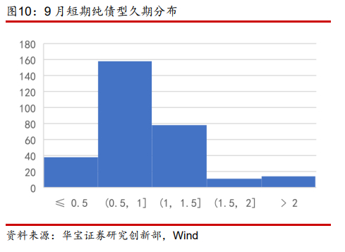 久期分布方面,短期纯债型基金的久期在(0.5,1]区间的数量占多,相比8月,短期纯债型基金在(0,0.5]区间的数量占比略有减少。少数基金久期高于2.5年。尽管短期纯债型基金的久期直观上被认为分布在(0,1)之间,但根据高频跟踪数据和半年报中披露的利率敏感性久期看,由于产品定制需求、基金经理个人风格等原因,某些短期纯债型基金具备较高的久期。