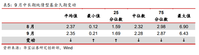 2023年9月,中长期纯债型基金久期整体缩短,中位数下降0.03年至2.28年,平均值下降0.03年至2.35年,25分位数和最小值则有所上升。