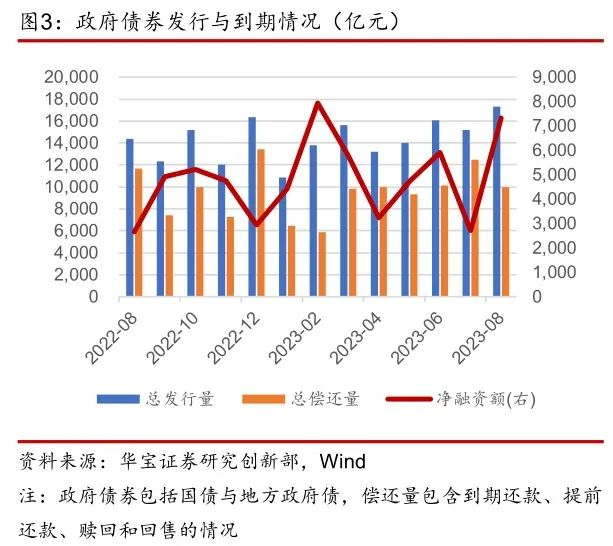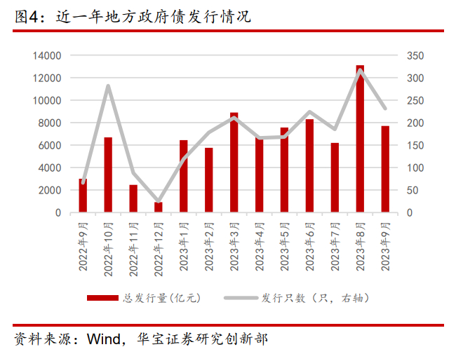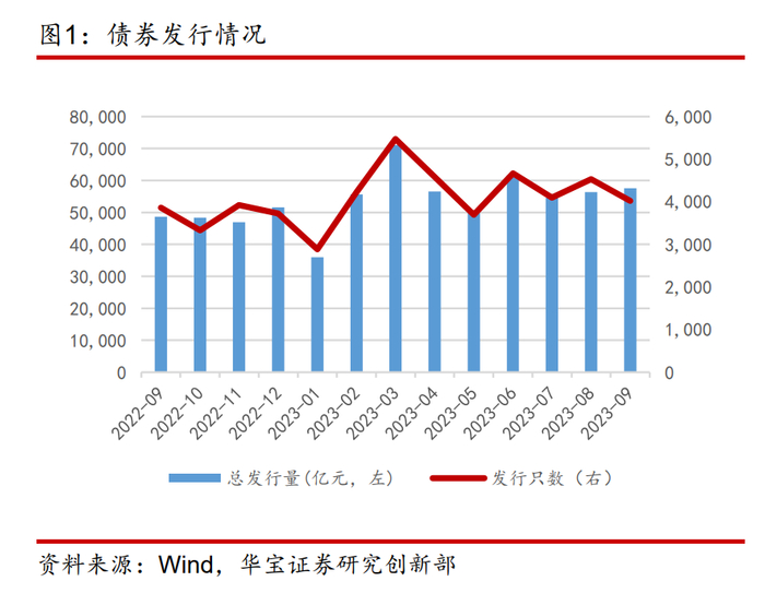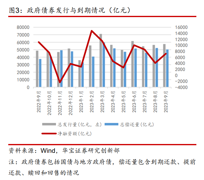 债券发行与到期方面,2023年9月,债券市场新发行4019只债券,合计规模5.76万亿元。9月地方政府债券发行额仍维持相对高位,后续建议跟踪化债方案落地情况。