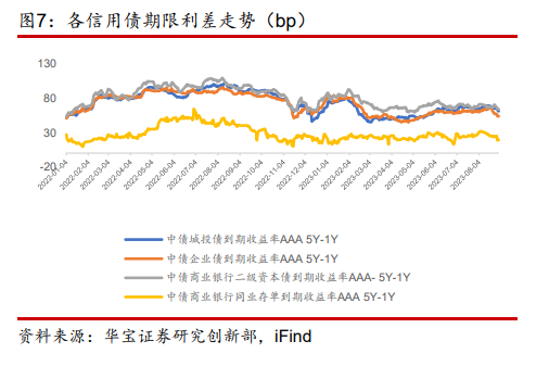 期限利差方面,除企业债外,各信用债高等级5年期与1年期品种的期限利差均有所收窄。其中,城投债期限利差52.32bp,位于2022年以来的12.50%分位数水平;企业债期限利差54.1 bp,位于2022年以来的18.40%分位数水平;商业银行二级资本债期限利差55.13 bp,位于2022年以来的1.50%分位数水平;商业银行同业存单期限利差10.99bp,位于2022年以来的1.10%分位数水平。