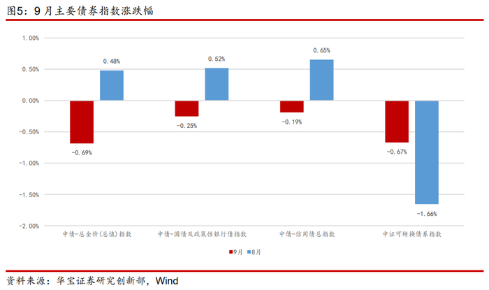 2023年9月债市显著回调,中债-总全价(总值)指数下跌0.69%,中证转债指数全月下跌0.67%;中债-国债及政策性银行债指数全月下跌0.25%,信用债跌幅较小,中债-信用债总财富指数全月下跌0.19%。