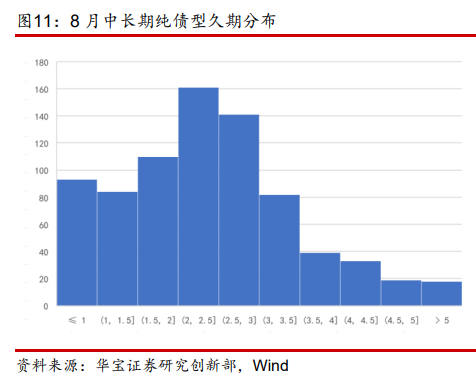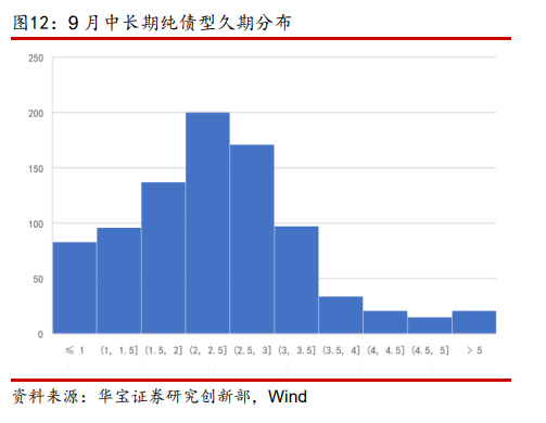 久期分布方面,中长期纯债型基金的久期主要集中于(2,2.5]之间,少数基金久期高于4。
