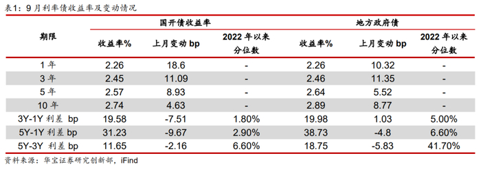 债券市场回顾:9月债市呈震荡上行的趋势。8月末至9月初,“稳增长”政策落地节奏超出预期,尤其是存量首套房贷利率下调、降低首付比例下限、部分城市“认房不认贷”等地产支持政策相继落地,债市回调,赎回压力下银行理财开始抛售基金,机构赎回行为再度演绎,10Y国债收益率由2.5850%上升至2.6375%;月中,机构赎回压力减弱,虽然面对汇率压力,14日央行仍降准释放流动性,10Y国债收益率下行至2.6075%;月末,受广州多区域放开限购政策等因素影响,10Y国债收益率持续上行至2.6976%,随后央行三季度货币政策执行报告传递出中性偏松的货币政策基调,10Y国债收益率下行至2.6751%。
