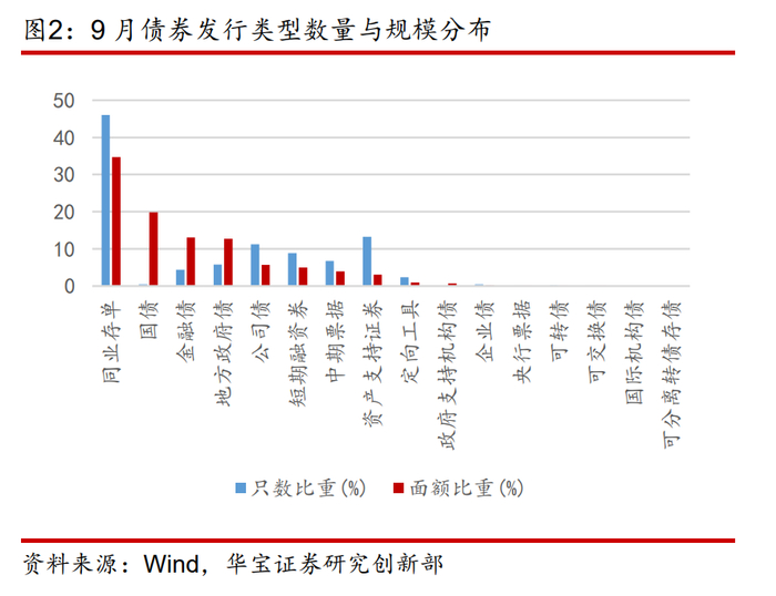 2023年9月,债券市场新发行4019只债券,环比下降11.24%,合计规模5.76万亿元,环比上升2.10%。其中,同业存单的发行数量最多,占比为46.02%,其次是资产支持证券,占比为13.26%。新发面额规模最大的券种是同业存单,占比为34.67%,其次是国债和金融债,新发规模占比分别为19.85%和13.05%。