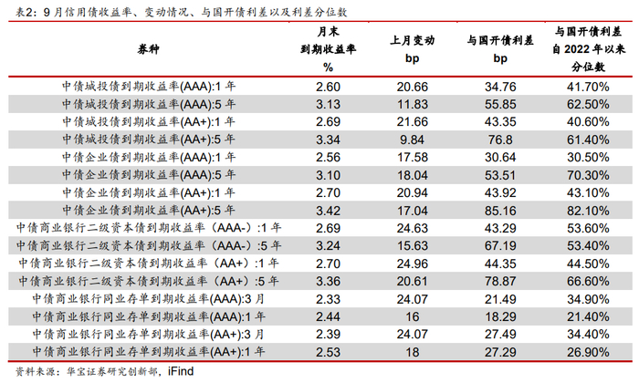 对于观察券种与国开债到期收益率的利差,1年期中债城投债到期收益率(AAA)与对应期限国开债到期收益率利差为34.76bp,位于2022年以来的41.70%分位数水平;1年期中债企业债到期收益率(AAA)与对应期限国开债到期收益率利差为30.64bp,位于2022年以来的30.50%分位数水平;1年期中债商业银行二级资本债到期收益率(AAA-)与对应期限国开债到期收益率利差为43.29bp,位于2022年以来的53.60%分位数水平;3月期中债商业银行同业存单与对应期限国开债到期收益率利差为21.49bp,位于2022年以来的34.90%分位数水平。其他数据在表2中展示。