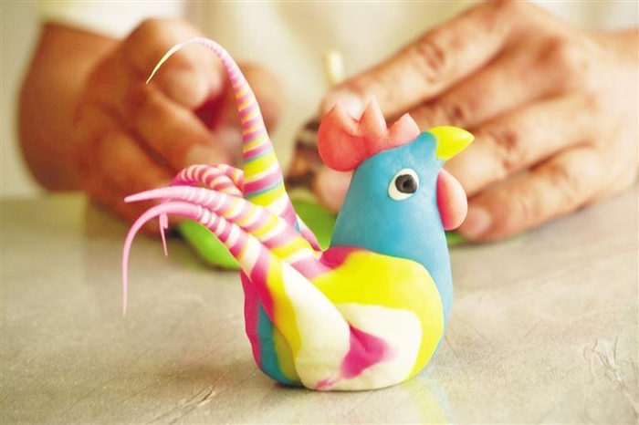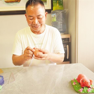 ← 邓笔先在捏面塑作品。