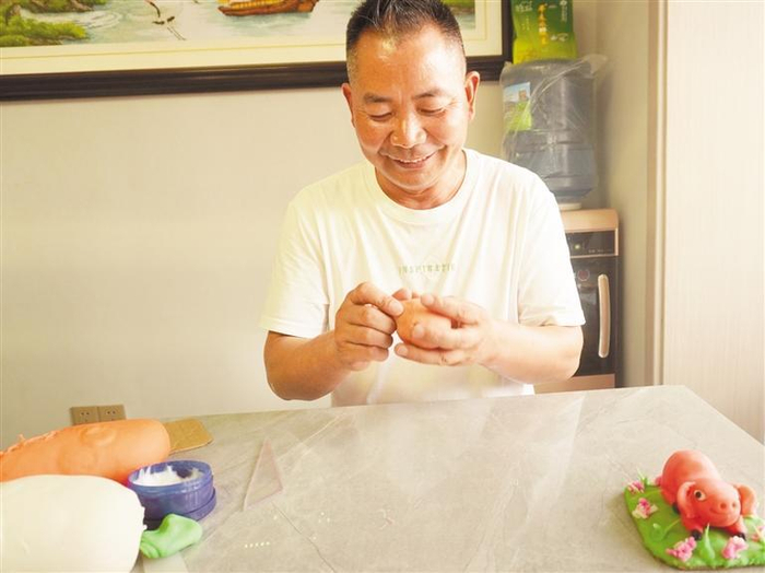 自有记忆起,面塑就一直在邓笔先的生活中。“小鸡、小狗、龙……那时候,乡邻家里有祭祀都会上门请奶奶捏面塑。”邓笔先说,每当奶奶捏面塑时,自己就在一旁看着。在奶奶的一双巧手下,十二生肖、寿桃、猪八戒等面塑栩栩如生,制作时总会吸引很多小朋友。
