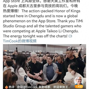 库克在微博中发布视频并提及,“精彩刺激的《王者荣耀》诞生于成都,现已在App Store上风靡全球。”