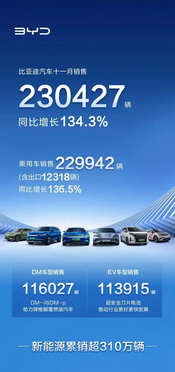 近日,部分新能源车企陆续公布了11月单月销量,比亚迪以230427辆的引领中国新能源车销量冠军榜,创中国新能源销量新高。连续3个月单月销量连续突破20万辆,部分车型的销量超过10家新势力车企的销量总和。