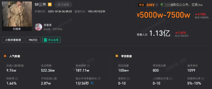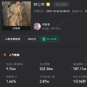 就是这种让很多人直呼没见过的带货方式,让“郑香香”账号10月4日单场带货GMV高达5000万-7500万,单场平均在线人数达2.87万,单场涨粉187.11万。