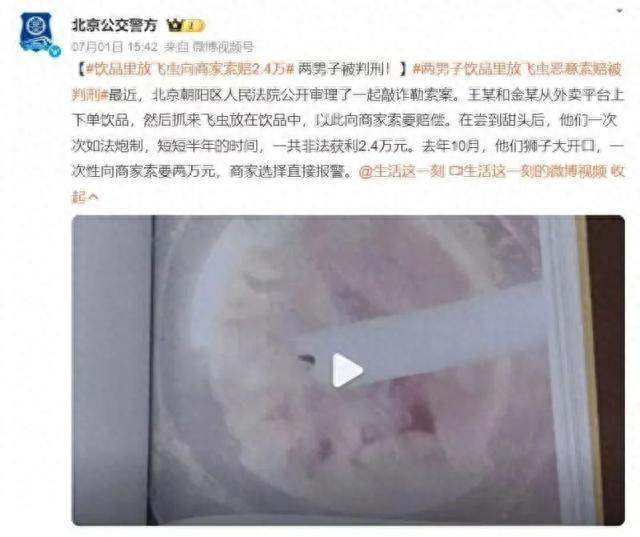 两男子从外卖平台下单饮品,然后抓来飞虫放在饮品中,以此向商家索要巨额赔偿。在尝到甜头后,他们故技重施,短短半年时间非法获利2.4万元。商家报警后,两男子因涉及敲诈勒索而被判刑。
