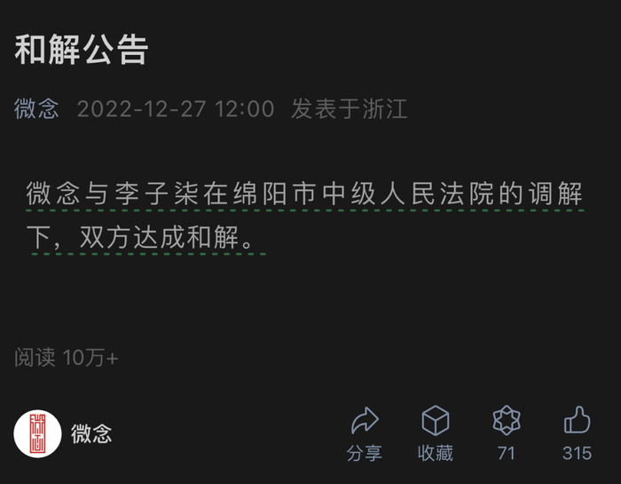 直至一年后,相关问题才得以解决。2022年12月,微念发出一则“和解公告”,称已与李子柒在绵阳市中级人民法院的调解下达成和解。