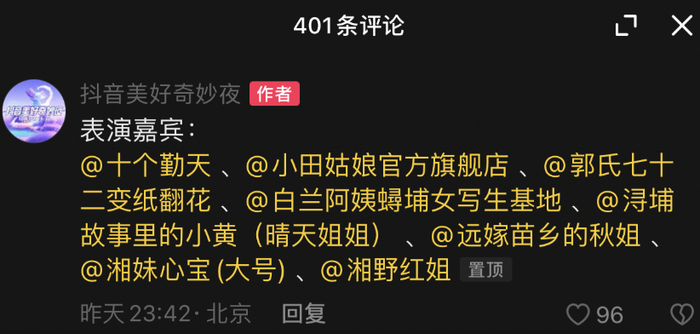 再比如,抖音美好奇妙夜当晚出现的湘野红姐、小田姑娘、湘妹心宝等,均为百万粉丝级别的乡村田园风内容博主。