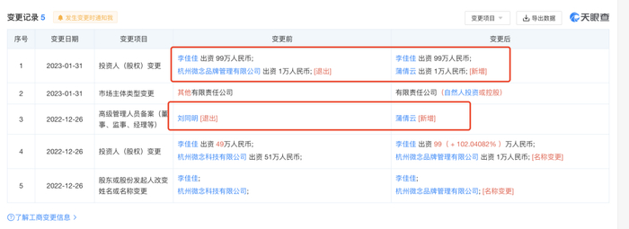 与此同时,李子柒关联公司“四川子柒文化传播有限公司”(下称子柒文化)发生工商变更,李子柒本人的股权占比从原来的49%提升到了99%,杭州微念持股比例由51%减至1%,直至今年杭州微念完全退出。