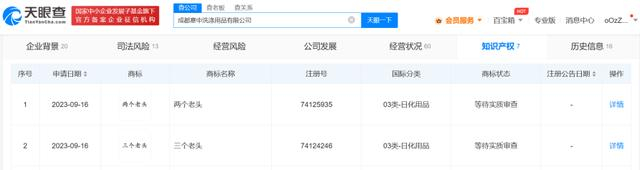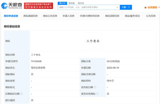 中国经济周刊—经济网讯 天眼查App显示,近日,活力28关联公司成都意中洗涤用品有限公司申请注册“三个老头”“两个老头”商标,国际分类为日化用品,当前商标状态均为等待实质审查。