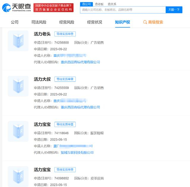 成都意中洗涤用品有限公司成立于2018年3月,法定代表人为何品波,注册资本100万人民币,由3位自然人股东持股。据媒体报道,该公司为“活力28衣物清洁旗舰店”的运营公司,不久前,三位“老头”为“活力28”直播带货走红,被网友称为“活力大叔”“活力老头”。天眼查显示,除上述公司外,近期还有公司或个人申请“活力大叔”“活力老头”“活力宝宝”商标,国际分类包括广告销售、服装鞋帽等,当前商标状态均为等待实质审查。