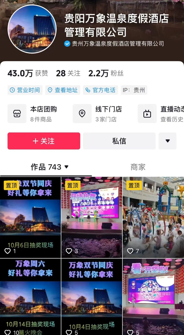 比如,小K有一点并未留意:那个让他改变黄金周度假计划的贵阳万象酒店,一度登上过抖音当地豪华酒店榜和温泉/收藏热销的第一名。
