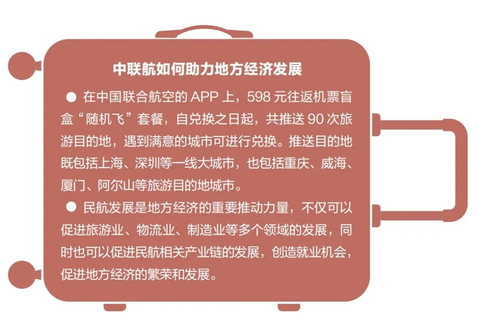 在中国联合航空的APP上,598元往返机票盲盒“随机飞”套餐,自兑换之日起,共推送90次旅游目的地,遇到满意的城市可进行兑换。推送目的地既包括上海、深圳等一线大城市,也包括重庆、威海、厦门、阿尔山等旅游目的地城市。在今年五一、国庆假期,各大航司都在疯狂涨价的情况下,中联航提供了一种更务实的玩法。