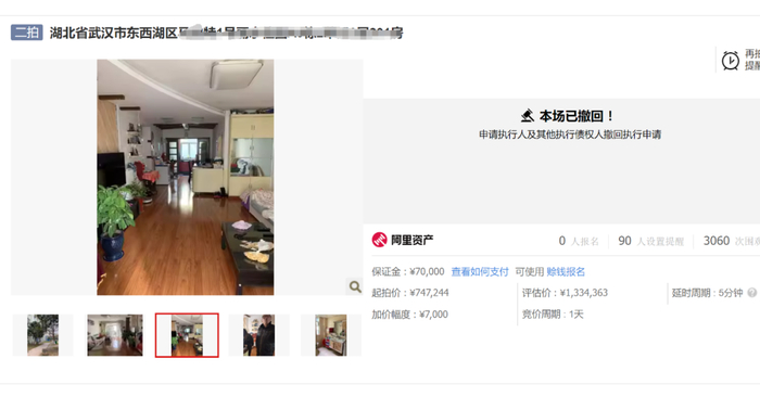 10月17日,此前显示为二拍时间,评估价为1334363元(约12192元/平方米),起拍价为747244元(约6800元/平方米),相当于评估价5折拍卖,0人报名,目前申请执行人及其他执行债权人撤回执行申请,该拍卖已撤回。
