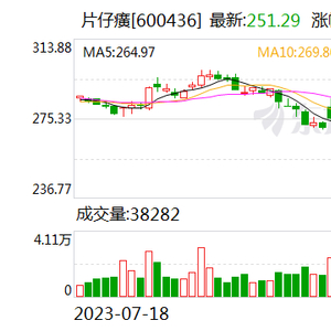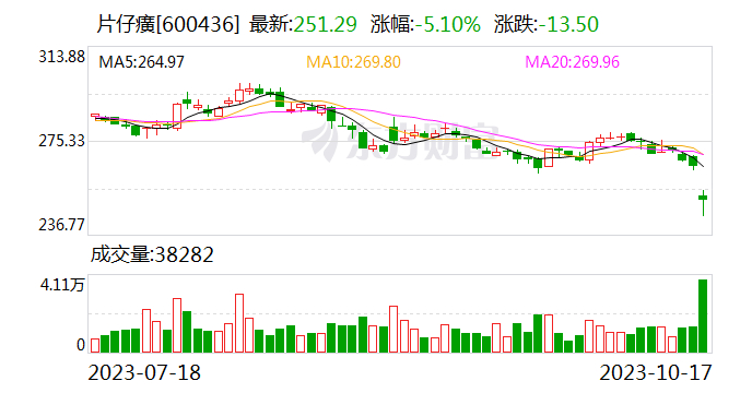 片仔癀(600436)今日低开低走,盘中一度大跌近8%,创年内新低。截至收盘,该股跌约5%报251.29元,最新市值1516亿元。