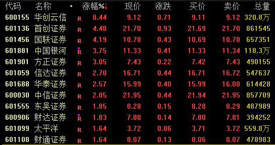 券商板块盘中强势拉升,截至收盘,华创云信涨近9%,盘中一度触及涨停;首创证券、国联证券涨超4%,中国银河、方正证券涨超3%,中信证券涨逾2%。