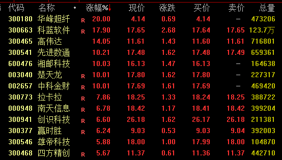 移动支付概念今日集体大涨,截至收盘,华峰超纤“20cm”涨停,科蓝软件涨近18%,盘中一度触及涨停;高伟达涨约14%,先进数通涨超10%,拉卡拉涨近8%。
