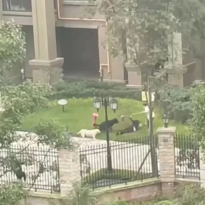 小区内大型犬扑倒撕咬两岁女孩。图源:网传视频截图
