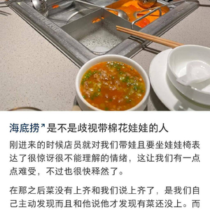 日前,有网友在社交媒体发帖称,自己和朋友各带了一个棉花娃娃到海底捞就餐,他们提出给娃娃坐店内婴儿椅的需求时,服务员露出不能理解的情绪,希望服务员给棉花娃娃过生日的要求也被拒绝。同时在就餐过程中,两人经历了感觉被冷落的服务,一些服务细节没有做到位,少了菜也一直到快吃完才补上。