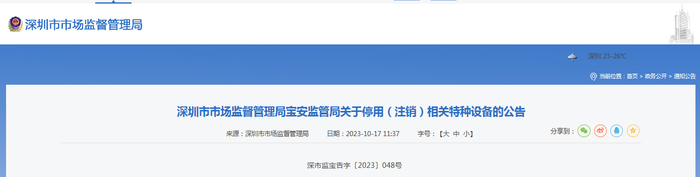 深圳市市场监督管理局宝安监管局关于停用(注销)相关特种设备的公告