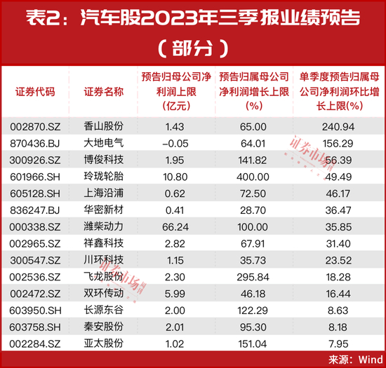 进一步来看,不少公司三季度业绩预计迎来环比增长。如香山股份、大地电气、博俊科技、玲珑轮胎、上海沿浦、华密新材、潍柴动力、祥鑫科技等多家公司第三季度净利润预计环比增长上限均超过30%(见表2)。