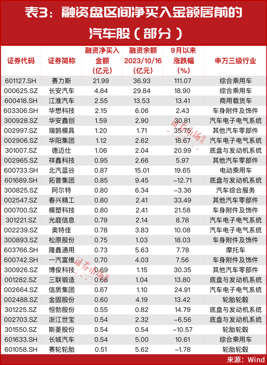 从个股来看,期间部分个股获融资盘净买入金额较高,如赛力斯被净买入金额超过20亿元,此外,包括长安汽车、江淮汽车、华安鑫创、瑞鹄模具、华阳集团、德迈仕等在内的7只个股被净买入金额同样较高,均超过亿元(见表3)。
