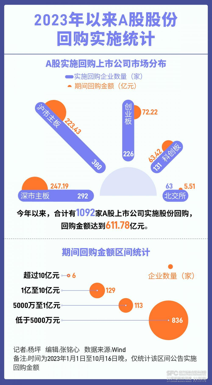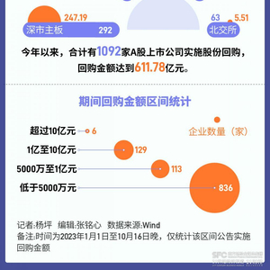 Wind数据显示,今年以来,截至10月16日晚,已有1092家上市公司实施了股份回购,回购金额合计达到611.79亿元,包括沪深主板672家企业合计斥资470.62亿元实施回购;创业板、科创板、北交所分别有226家、131家、63家企业斥资72.22亿元、63.42亿元和5.51亿元用于回购。