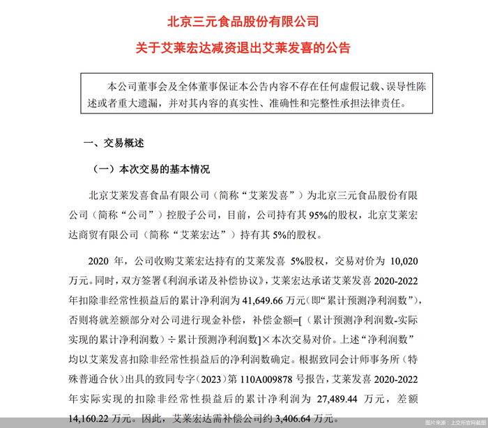 三元股份并未在公告中透露具体减资价格,但通过此前收购价格或许能大致估算。2020年,在艾莱宏达向三元股份出售所持艾莱发喜5%股权时,艾莱发喜截至2019年6月30日的净资产为7.81亿元,评估值为20.04亿元,其5%股权的交易价格为1亿元。扣减3406.64万元业绩补偿后,三元股份仍需付出6593.36万元,才能拿下艾莱发喜全部股权。