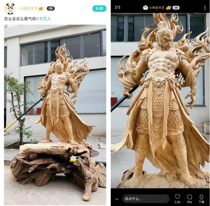 压力最大的那段时间,单敏航会在Soul上和大家聊聊天,无论是回应关于其分享有趣作品的见解,还是和平台上相识的其他手艺人切磋讨论,都成为了那段紧张赶工期间少有忙里偷闲的时光。一次,他分享了一个“孙悟空”主题的木雕作品,评论区一下子就爆了,大家七嘴八舌的讨论着“怎么把眼神雕刻的如此霸气”“这么大的作品,错一刀如何补救”,而单敏航则在评论区里一一回复大家的好奇。