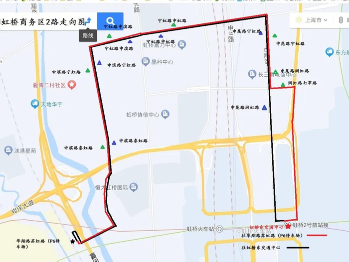 虹桥商务区2路调整后的走向为:上行自华翔路苏虹路(P6停车场)起经华翔路、苏虹路、申滨南路、申滨路、宁虹路、申昆路至虹桥东交通中心止;下行自虹桥东交通中心起经七莘路、润虹路、申昆路、宁虹路、申滨路、申滨南路、苏虹路至华翔路苏虹路(P6停车场)止。