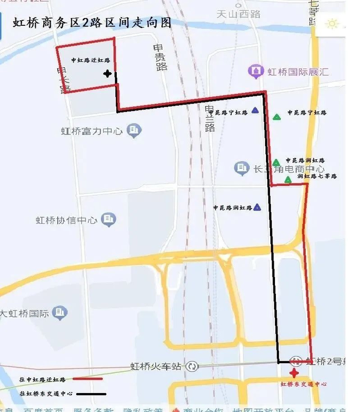 根据客流情况,虹桥商务区2路区间在早、晚高峰分别运营3个小时,从申虹路迁虹路发车的高峰线时间段为6:30—9:30、16:30—19:30;从虹桥东交通中心发车的高峰线时间段为6:45—9:45、16:45—19:45。