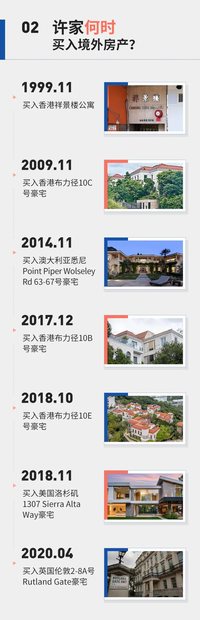 部分可被追踪的持有或曾经持有的房产,包括一处香港公寓房、三栋位于香港太平山顶的豪宅、一栋澳洲豪宅,一栋美国洛杉矶豪宅,以及一栋被誉为“英国最贵的豪宅”。但这些资产多以离岸公司或者“代持”的方式,一度隐藏了背后真正的所有者。