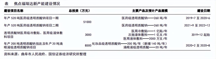 公司旗下焦点生物玻尿酸全球市占率15%,仅次于华熙生物。目前食品级和化妆品级玻尿酸年产能420 吨。此外,公司已具备 260 吨医药级玻尿酸产能。