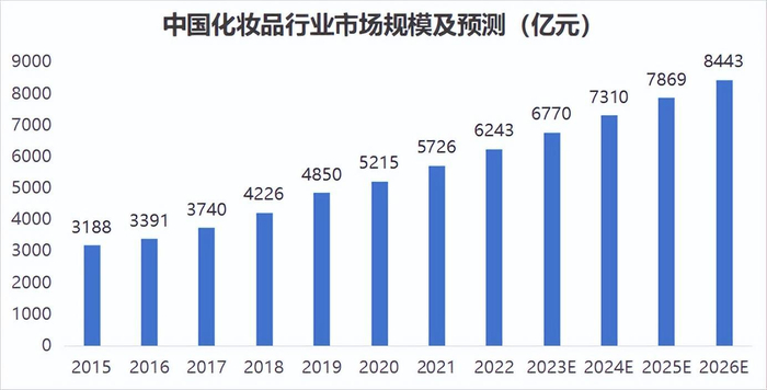 根据统计,2015年到2021年我国化妆品行业市场规模从3188亿元增加至5726亿元,复合年增长率10.3%,预计2026年将达到8443亿元。