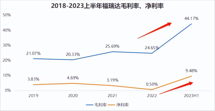 但是,化妆品、生物医药毛利率高,2022年分别是61%、53%。2019年到2023年上半年,福瑞达的化妆品营收占比从3%提升到44.7%,医药营收占比从5.8%增加到11.8%。