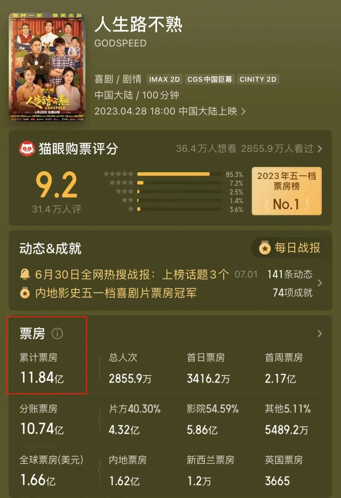 作为第一出品方的电影《人生路不熟》,票房11.84亿元,